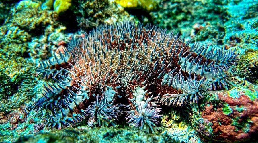 caractéristiques : entre 20 et 40 bras aspect très épineux, texture rugueuse couleur bleu à bleu gris rôle écologique important : super prédateur des zones rocheuses et récifales. Son régime alimentaire est carnivore (mollusques et autres invertébrés).